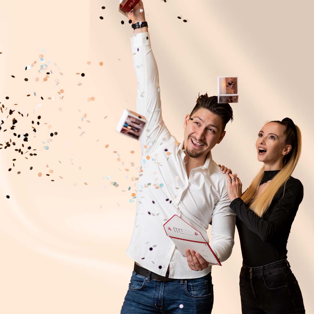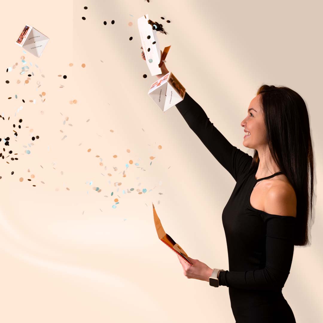 Dar adevărata surpriză se află în interior! Când tragi de tragere, scrisoarea explodează într-un spectacol de confetti, iar cele două cuburi, personalizate cu fotografiile tale preferate, zboară în aer.